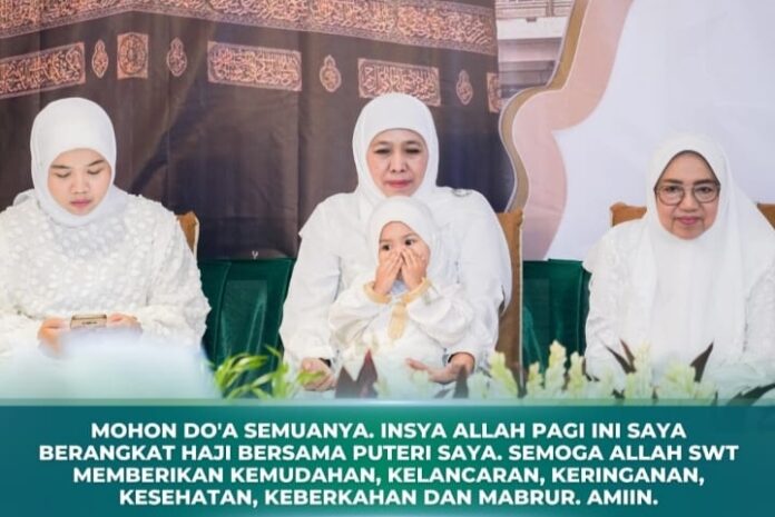 Diketahui Khofifah Indar Parawansa berangkat menunaikan ibadah haji bersama keluarga Selasa 11 Juni 2024 sebagai bentuk rasa cinta kepada Allah SWT dan Rasulullah Saw tidak lain untuk mengharap Ridho dan Syafaatnya.