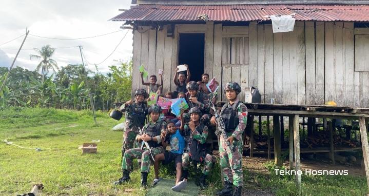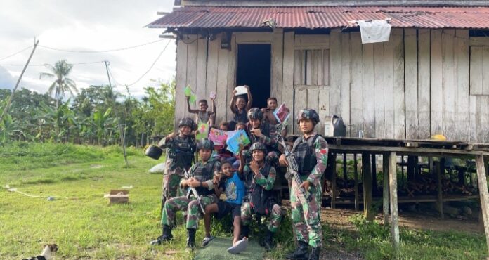 Kab.Keerom – Satgas Pamtas RI PNG Yonif 132/BS membagikan seragam sekolah dan alat tulis kepada anak-anak Kp.Kwimi, Distrik Arso, Kab.Keerom, Prov.Papua, Pada Hari Sabtu ( 4/2/2023).