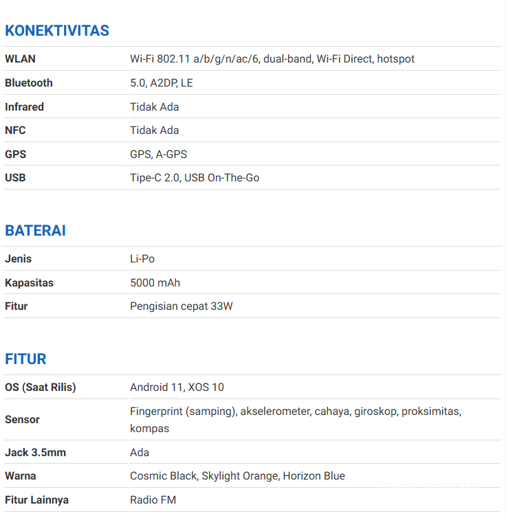 Smartphone ini juga dilengkapi dengan fitur pengisian cepat 33W, sehingga pengguna dapat mengisi daya dengan lebih efisien.