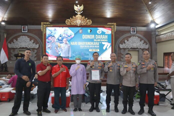 BALI INDONESIA, Hosnews.id – Dalam rangka memperingati Hari Bhayangkara ke- 77 yang jatuh pada tanggal 1 Juli setiap tahunnya, personel polda Bali menunjukan kepedulian sosial dengan mengikuti kegiatan donor darah yang diselenggarakan oleh Biddokkes Polda Bali bekerjasama dengan Persatuan Donor Darah Indonesia (PDDI) Unit Polda Bali di Gedung PRG Polda Bali. Rabu (14/6/2023).