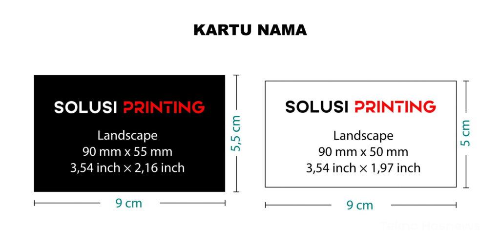 Namun, ukuran kartu nama yang umum digunakan adalah sekitar 8,9 cm x 5,1 cm (3,5 inci x 2 inci) dalam format horizontal.