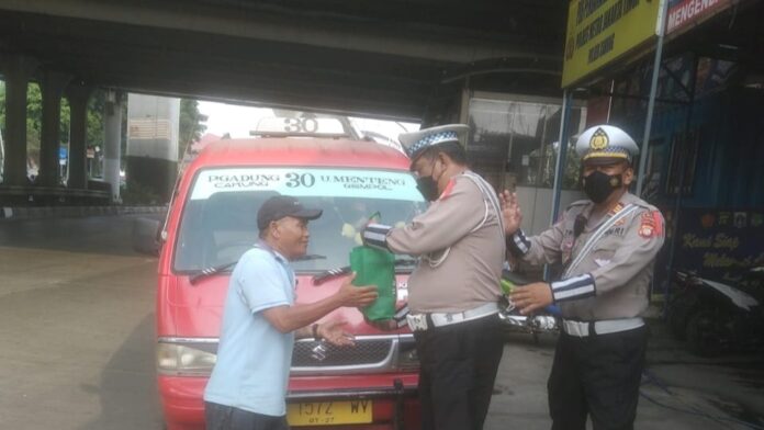 Paket Sembako dibagikan ke pedagang asongan, Supir Angkot dan tukang ojek pangkalan disamping pos Unit Lantas Cakung Jakarta Timur.