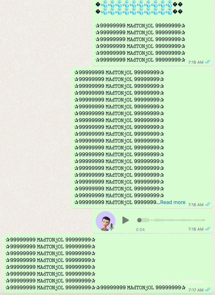 Bagi yang belum pernah dapat pesan spam virtex, mungkin penasaran seperti apa sih text virus yang dikirim? Nah, di bawah ini adalah contoh salah satu text virtex wa yang dikirim ke chat WhatsApp.