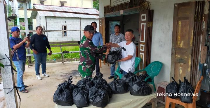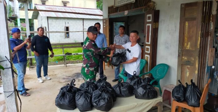 SAMBAS, KALBAR – Wujud Kepedulian serta untuk lebih mempererat rasa persaudaraan antar sesama dan sekaligus membantu perekonomian warga masyarakat perbatasan RI-Malaysia Desa Kaliau dan Desa Transmigrasi, Danpos Gabma Sajingan Satuan tugas pengamanan perbatasan (satgas pamtas) RI-MLY Yonif 645/Gardatama Yudha Letda Inf Latif Bersama SGI Tim I/ Sambas dan Imigrasi PLBN Aruk memberikan bantuan bahan makanan berupa paket Sembako, di Dusun. Sajingan Desa. Kaliau Kecamatan Sajingan Besar Kabupaten Sambas.